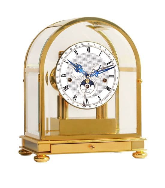 This superb solid brass mantel clock features the Hermle 4 bell 4x4 8 day movement and shows the date, day, month and year as well as a moonphase dial. The movement chimes every quarter hour, plus the hour count on the hour. A very delicate, crisp chime and strike from the 4 bells. Chimes can be shut off completely or just at night from 21.45 to 07.00.